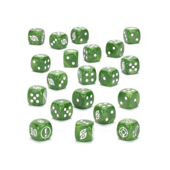 Set de 20 dados D6 de Grand Cathay en verde jade con muescas blancas y símbolo de facción en la cara del seis. Elegancia y poder en cada tirada.