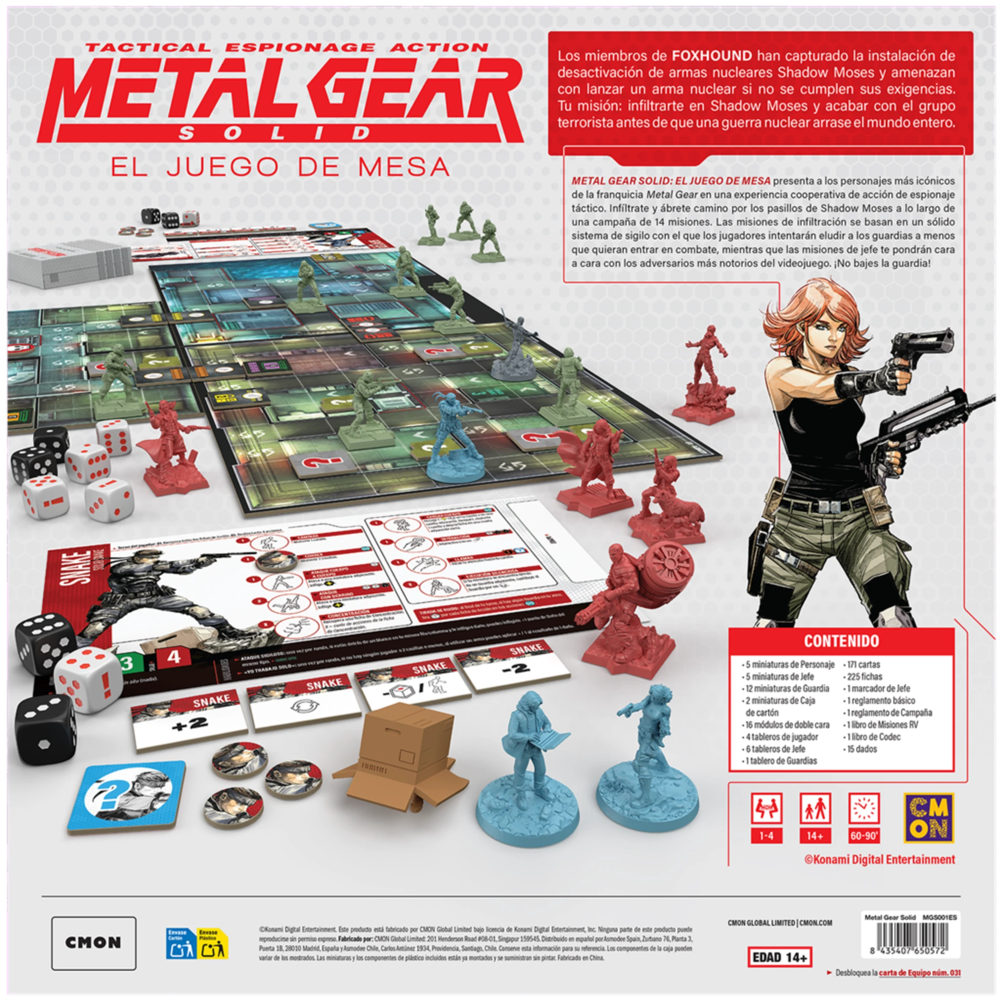 Cooperativo de 1 a 4 jugadores ambientado en Metal Gear Solid, con sigilo, miniaturas y campaña narrativa en Shadow Moses.